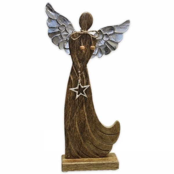 Elegantní dekorativní anděl, který v sobě spojuje přírodní krásu dřeva a lesk kovu. Díky svým kovovým křídlům s jemným stříbrným nádechem působí slavnostně a přitom decentně. V rukou drží hvězdu zavěšenou na jutovém provázku, která symbolizuje světlo a naději.