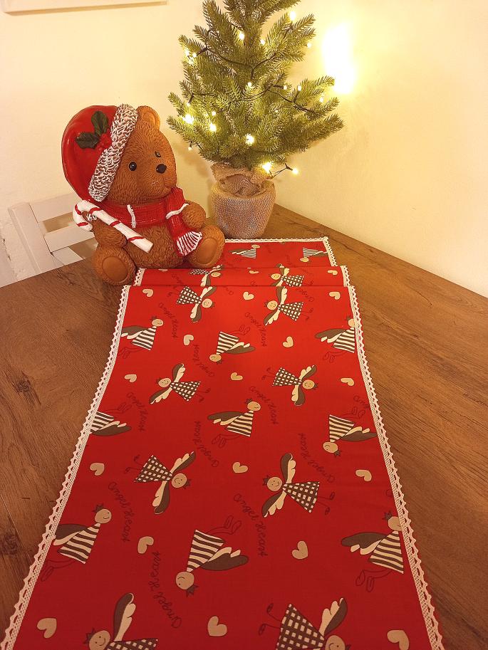 Vánoční běhoun s motivem andílků a srdíček vnese do vašeho domova hřejivou atmosféru adventního času. Červený podklad doplněný jemnou krajkou po obvodu působí romanticky a krásně vynikne na dřevěném i bílém stole.