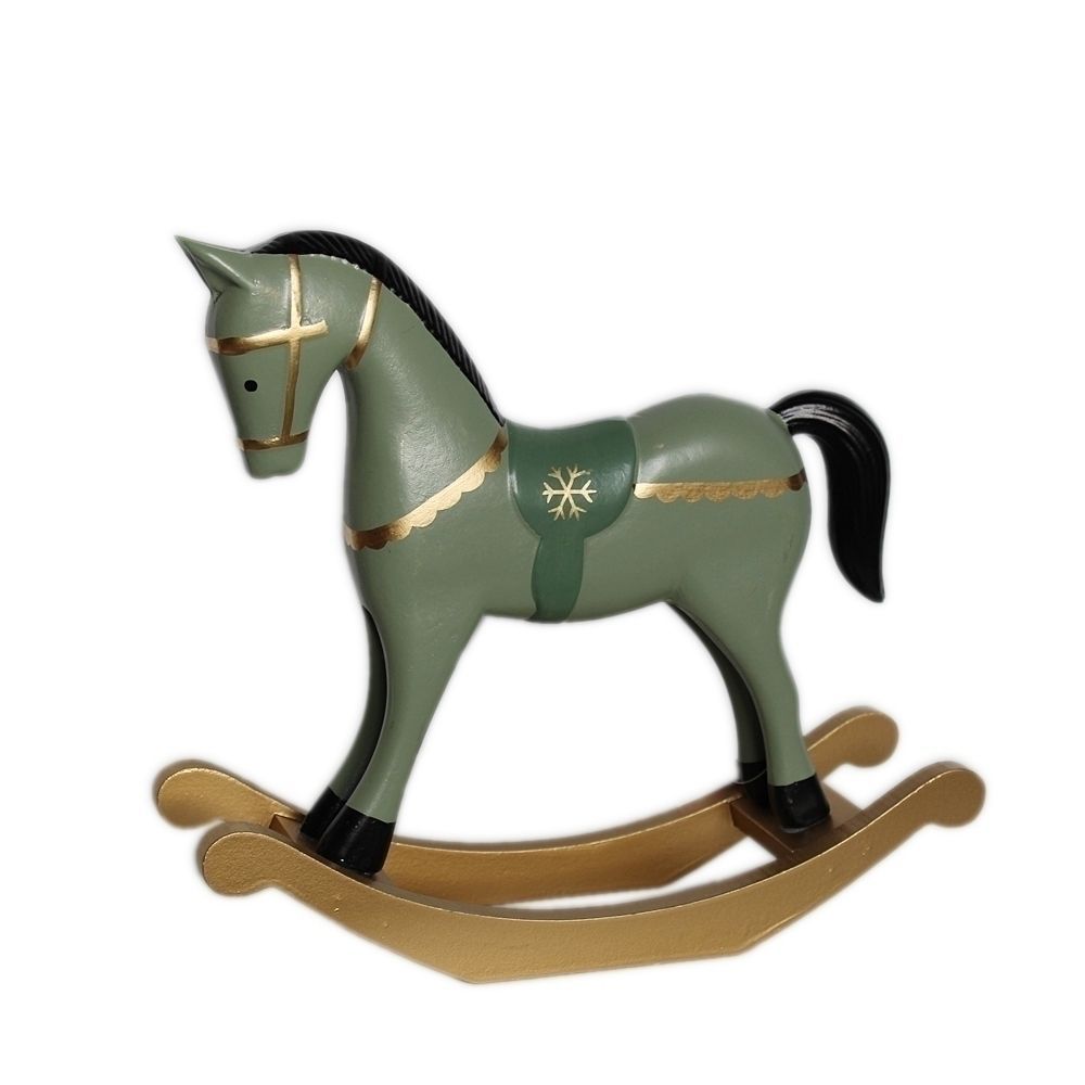 Tento dřevěný houpací koník v jemném zeleném odstínu vnese do vašeho domova kouzlo starých časů. Ručně opracovaný povrch a rustikální vzhled z něj dělají krásnou dekoraci nejen na Vánoce, ale i po celý rok – skvěle se hodí do farmhouse, venkovského či vintage stylu.