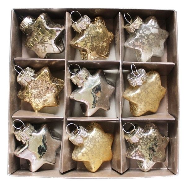 Jemné skleněné hvězdičky s antikovou patinou v kombinaci zlatých a stříbrných tónů dodají vašemu vánočnímu stromku i interiéru nádech elegance a nostalgie. Každá hvězdička je originál s drobnými nepravidelnostmi, které podtrhují ruční zpracování a starobylý vzhled.