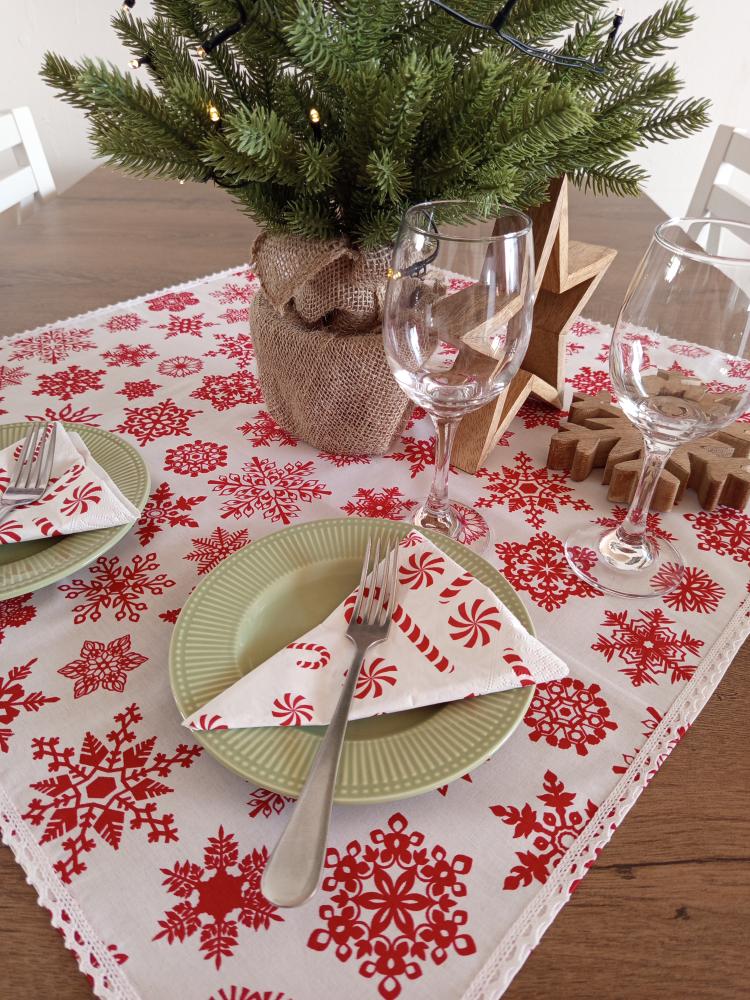 Vánoční ubrus s výraznými červenými vločkami na bílém podkladu dodá vašemu stolu svěží, čistý a zároveň rustikální vzhled. Díky jemné krajce na okrajích krásně zapadne do venkovského, rustikálního stylu.