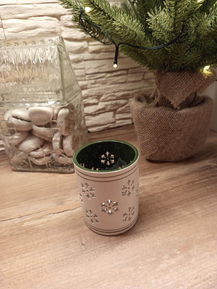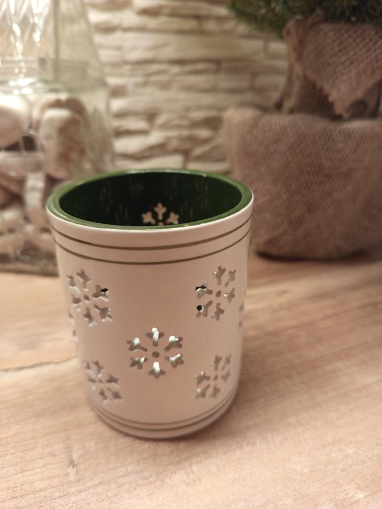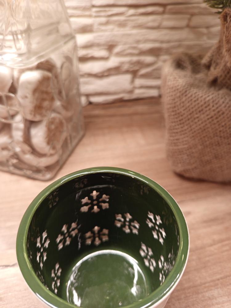 Rozměry: 7,6 x 7,6 x 9 cm.Materiál: keramika.Barva: bílá, zelená.UPOZORNĚNÍ: Drobné povrchové nedokonalosti nejsou vadou výrobku. Nenechávejte zapálené bez dozoru.