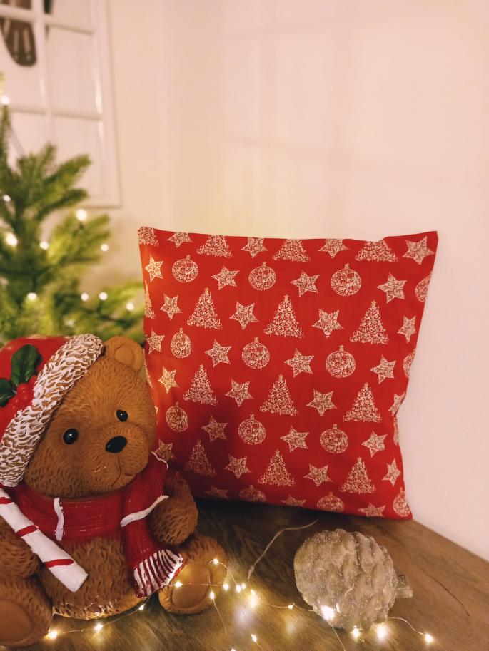 Vánoční povlak na polštář v sytě červené barvě s motivy hvězd, stromečků a ozdob vnese do interiéru kouzlo Vánoc.