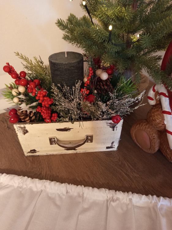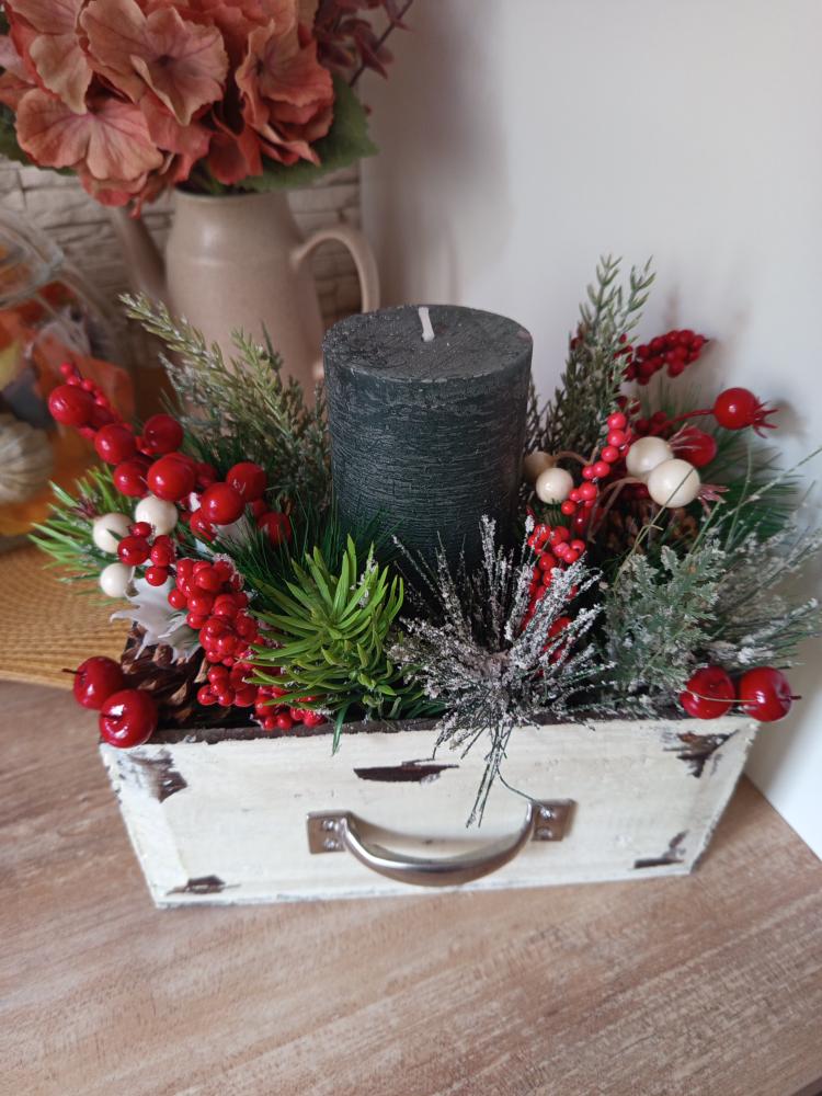Dřevěný šuplík s patinou, umělé chvojí červené bobule a tmavě zelená rustikální svíčka dohromady vytváří dokonalou venkovskou atmosféru.