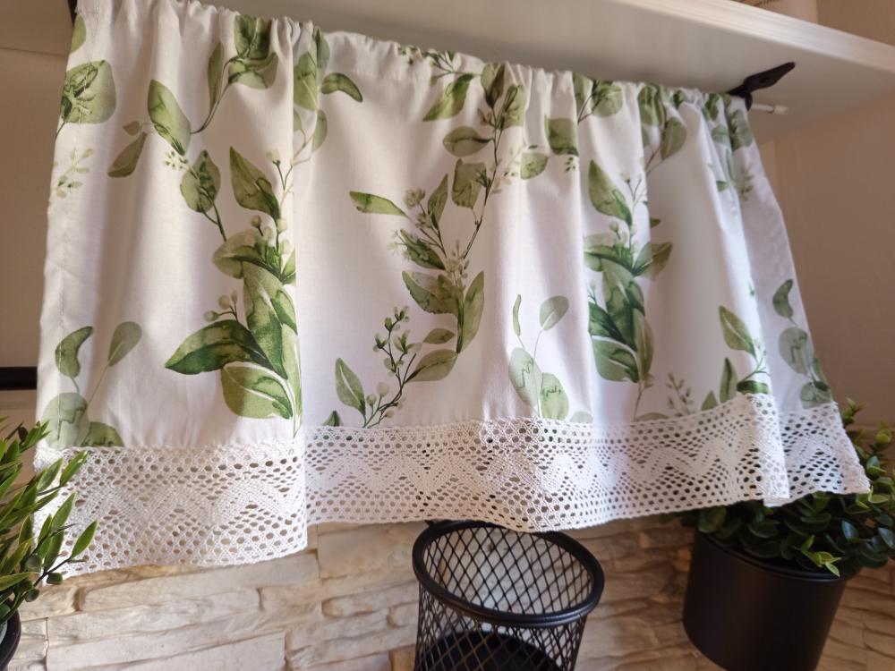 Lehká dekorační záclonka s přírodním motivem eukalyptu, doplněná o romantickou krajku ve spodní části. Ideální do malých jednoduchých oken jako např. koupelna, chodba, spíž... kde vytváří útulnou atmosféru bez zbytečného zatemnění. Stylový doplněk pro venkovský, Provence, cottage i moderně přírodní interiér, který zjemní okno a dodá prostoru svěží a čistý vzhled.