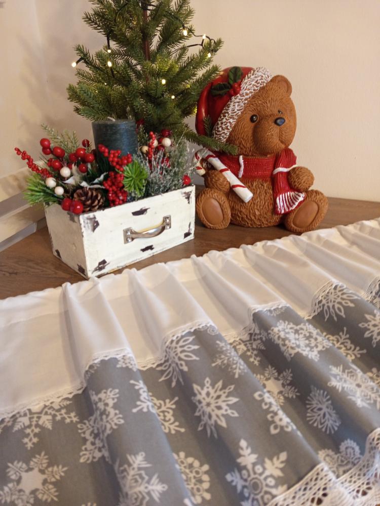 Elegantní zimní záclonka s motivem bílých vloček na šedém podkladu, zdobená krajkou.