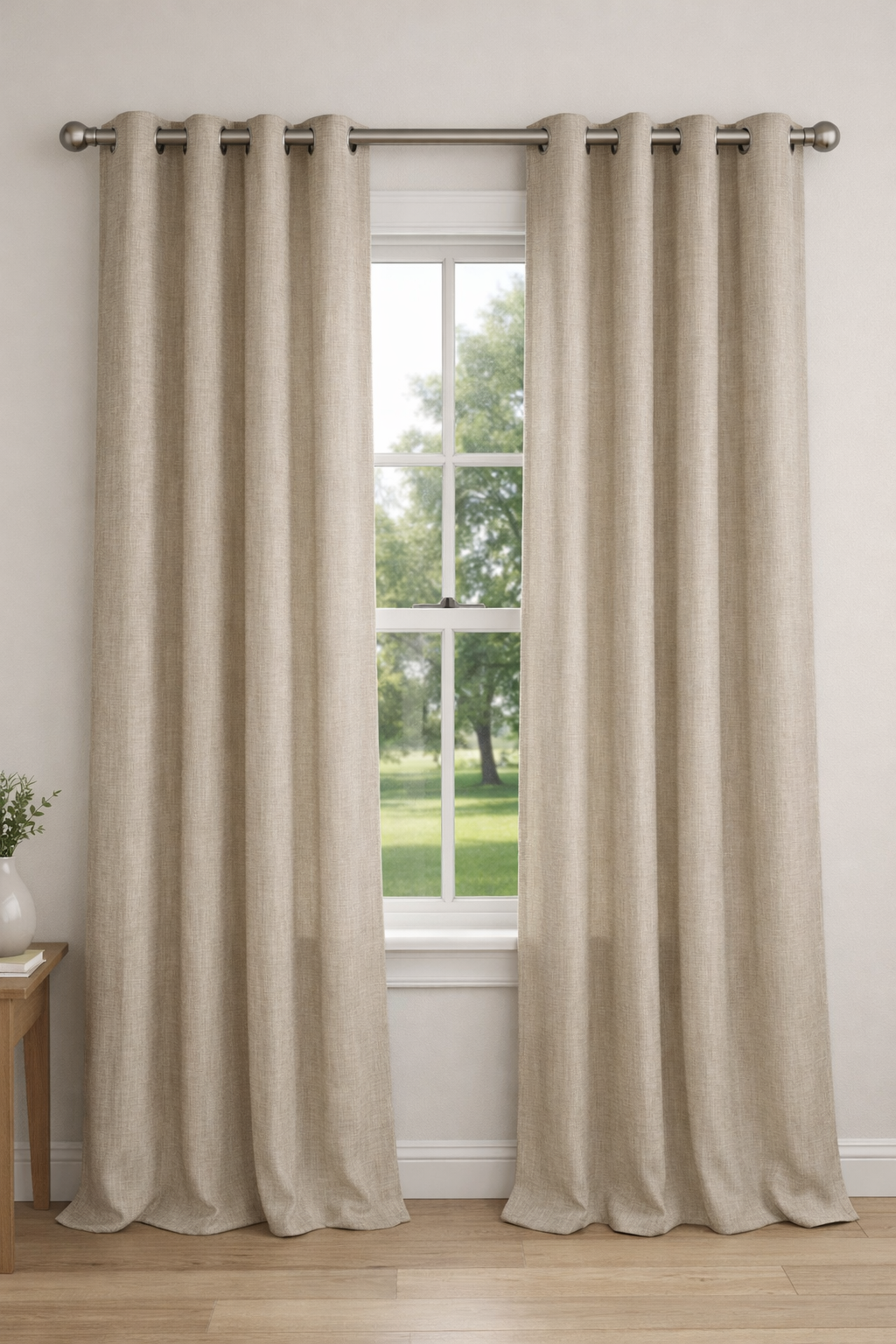 Závěsy a záclonka z kvalitního kanafasu, odstín cappucino. (Vzorník látky viz. detail druhá fotografie)